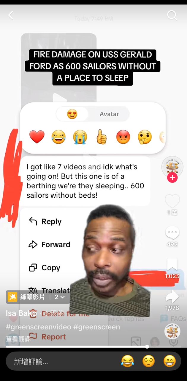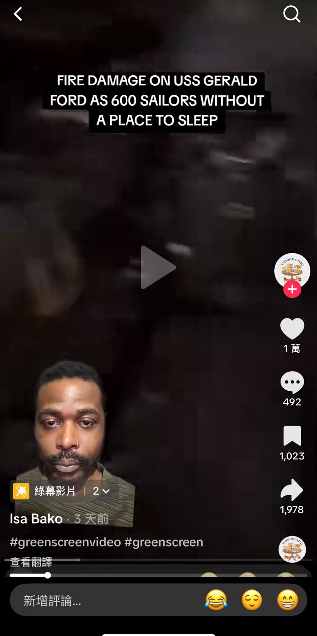 這個是福特號士兵把內部燒毀情況Po給TikTok頻道主的影片,燒成這樣,福特號修到猴年