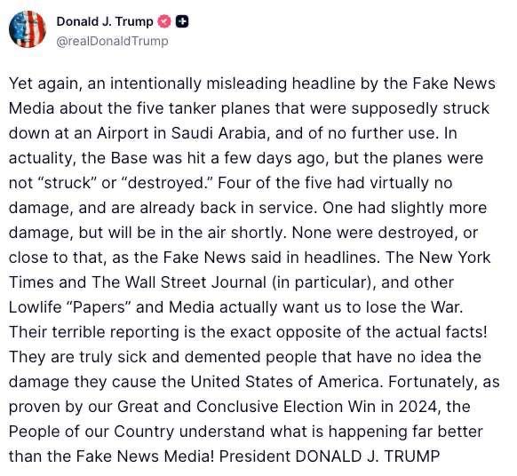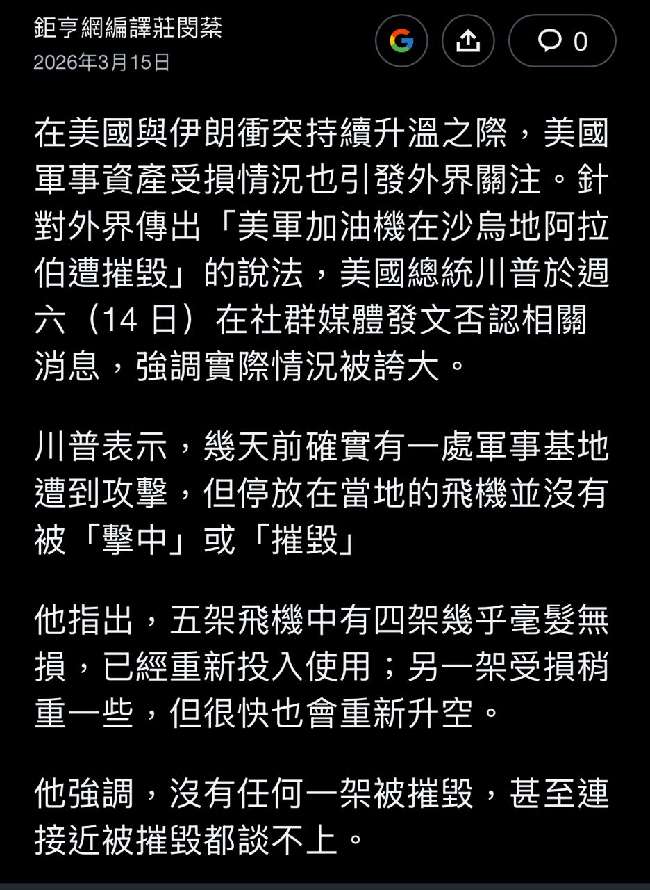 當時是3/15,整整兩週之前,川普那時還嘴硬說美軍基地有被攻擊但是加油機幾乎沒毀損