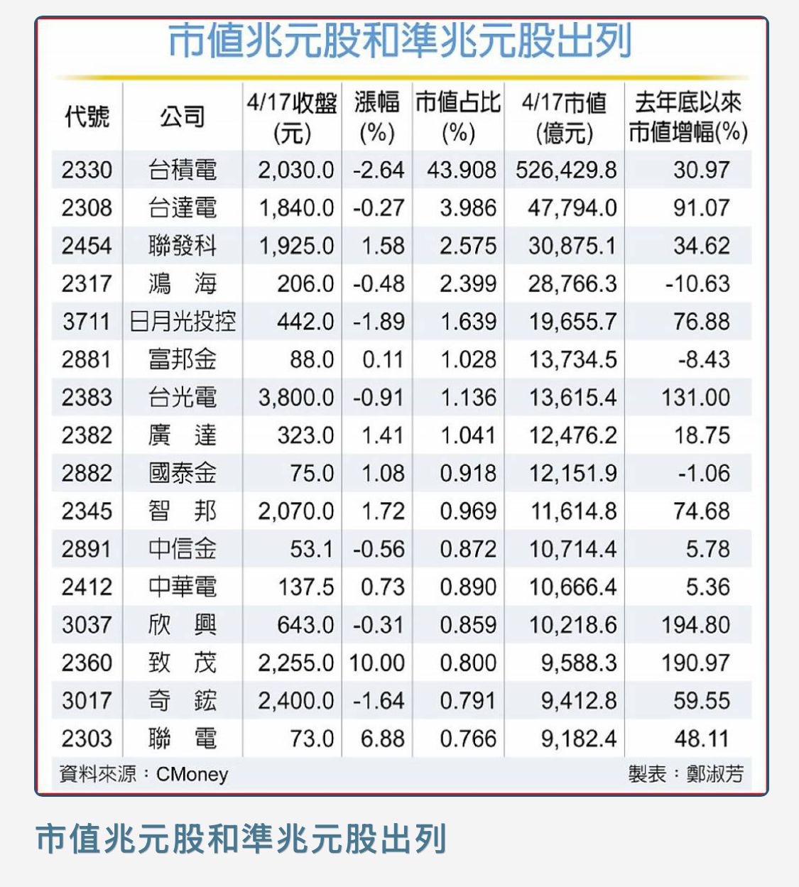 ,飆升至4月17日的52.64兆元,約當增加了12.45兆元,市值增加金額居台股之冠。