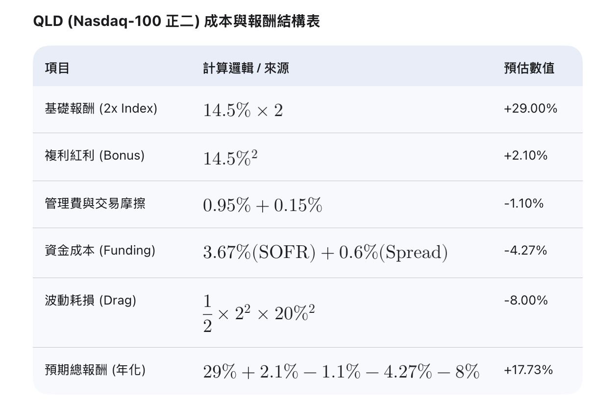 由於正二是每日再平衡,波動率會產生耗損(跌10%漲10% 100會變99),這個可以用長期