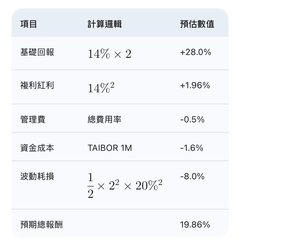但正二一樣有複利紅利(連續行情),計算方式就是報酬率平方。台股平均報酬率14%來
