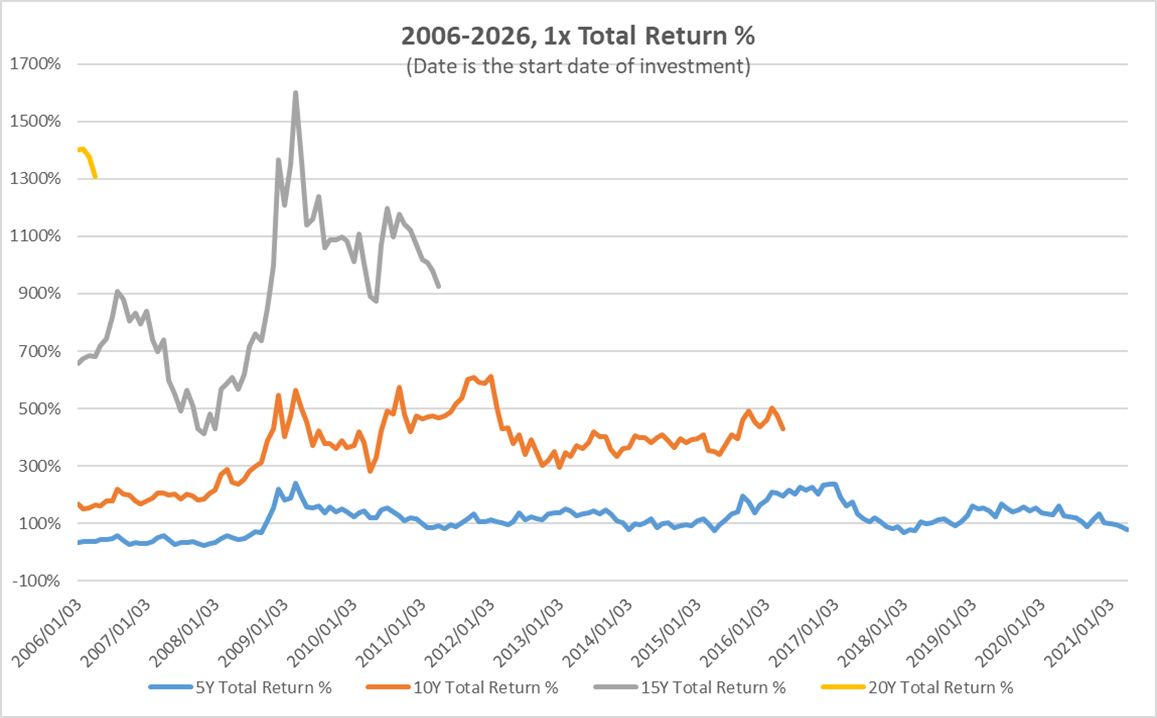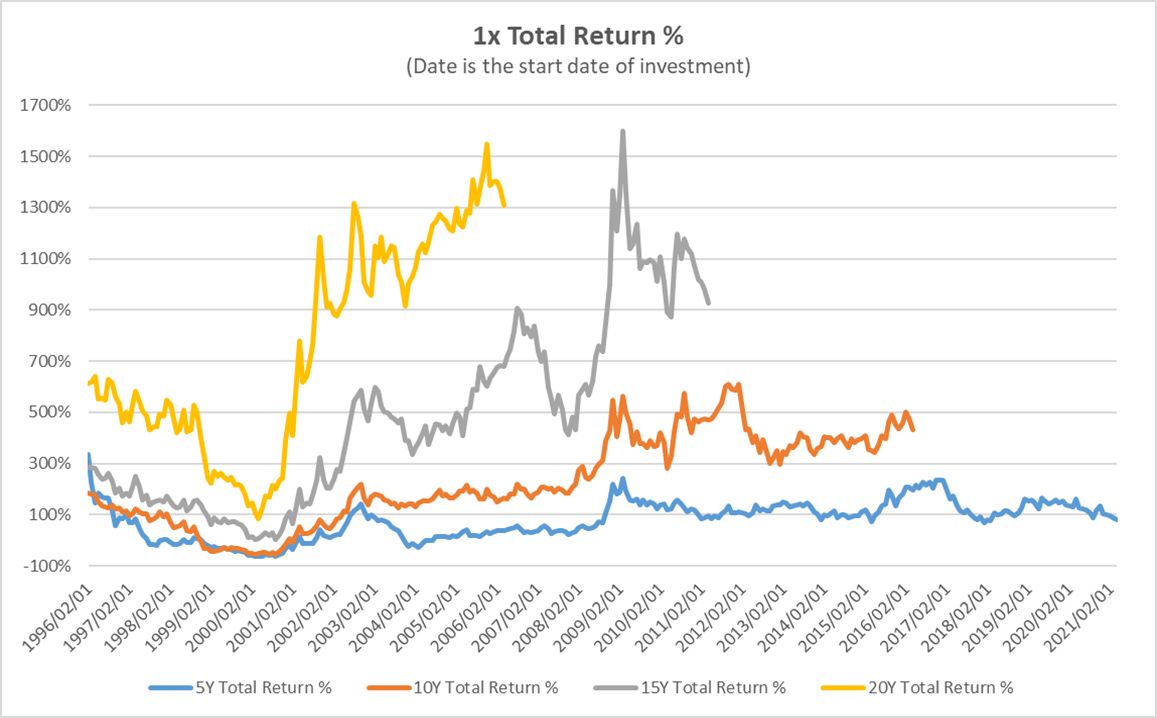 例如:2010/1買入5年持有到2015/1,算出總報酬%;2010/2買入5年持有到2015/2,算出