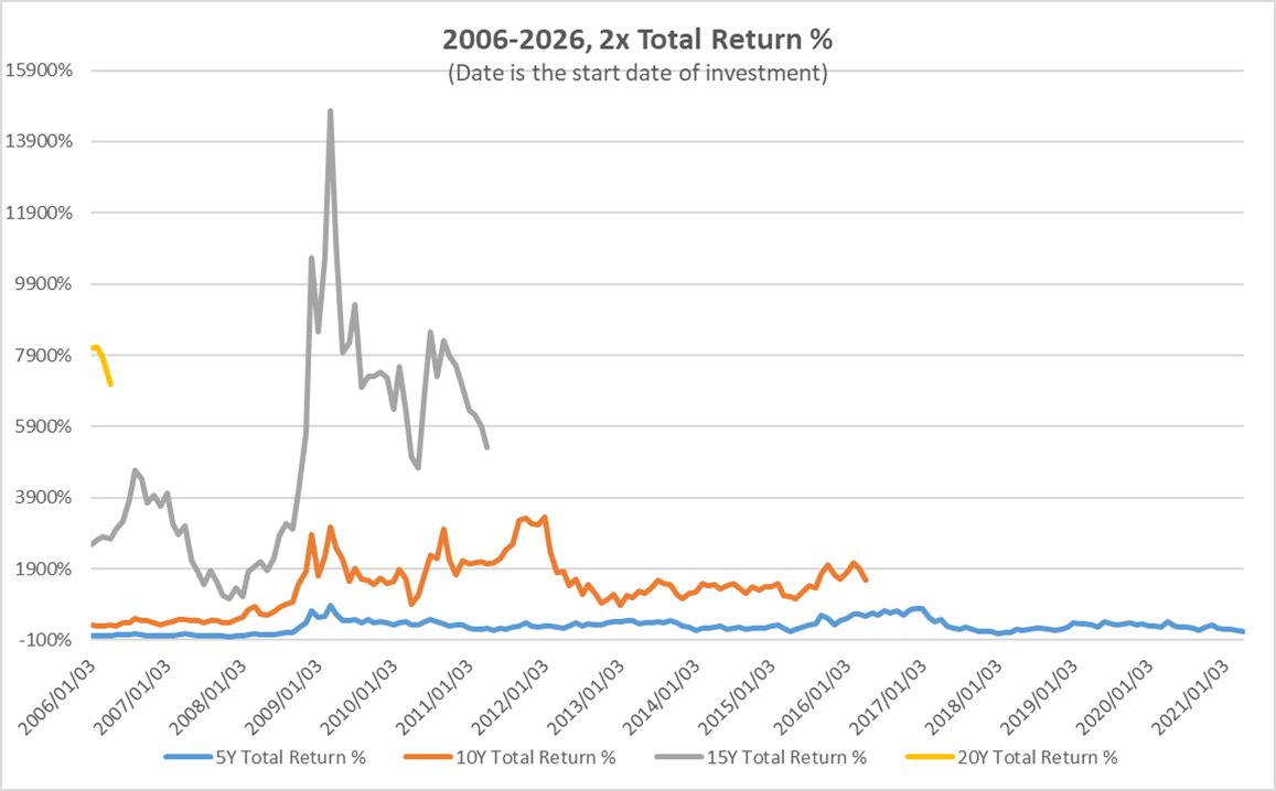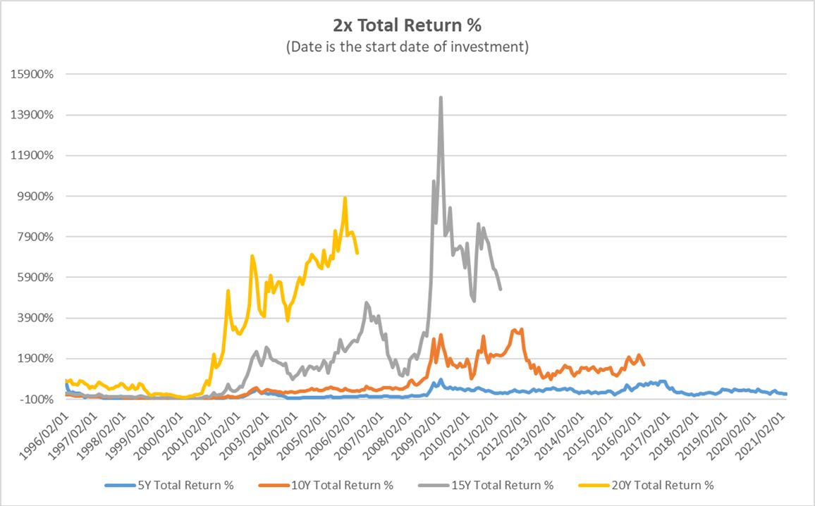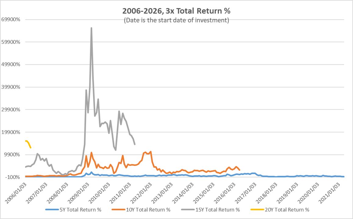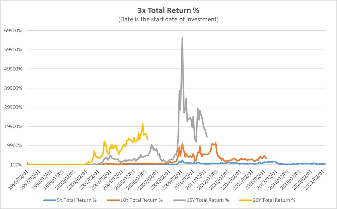 2. 就算僅看近20年,三倍雖然跑贏兩倍,但是表現似乎沒有想像中厲害(大概跑贏兩倍1