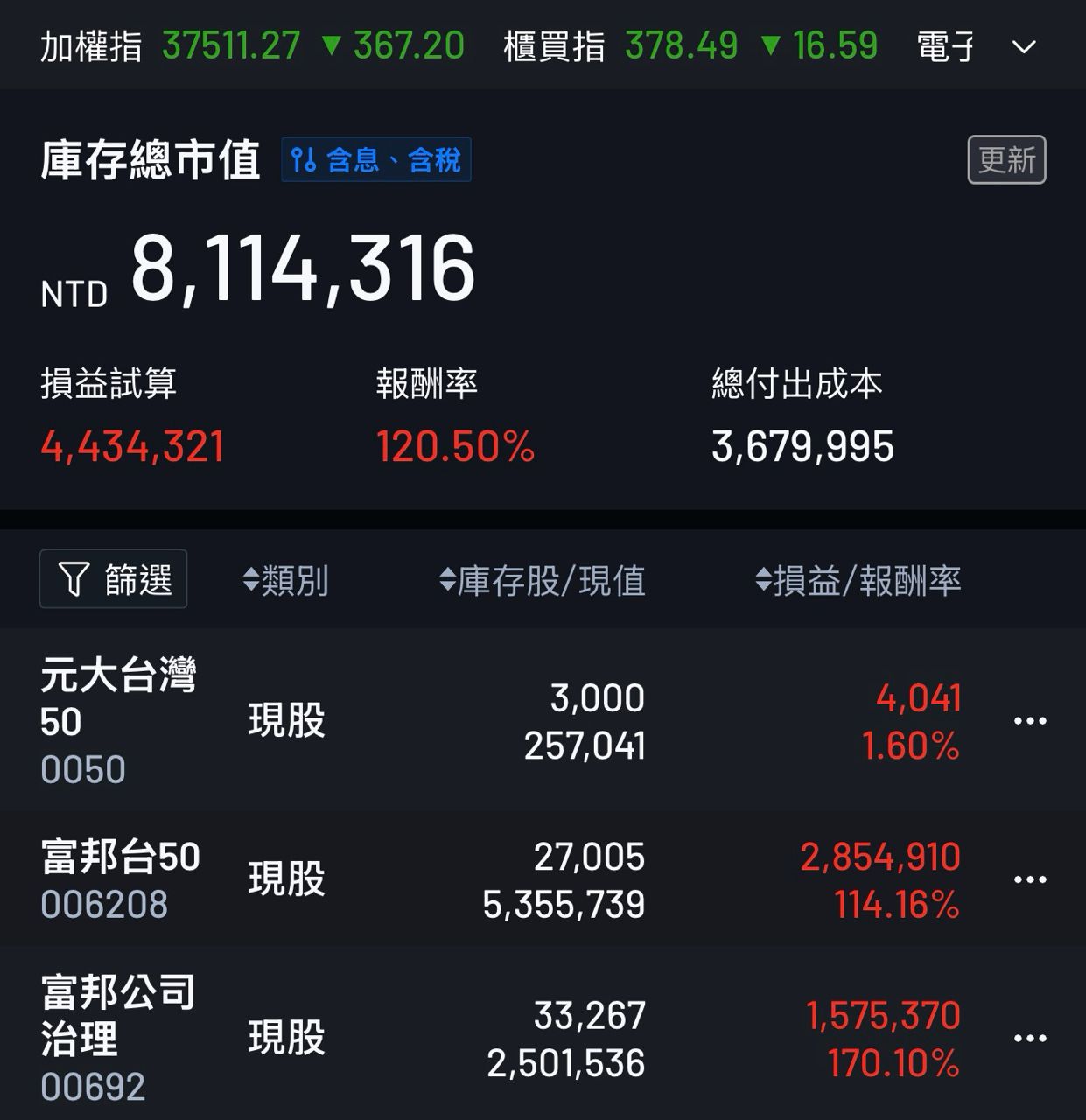 幫她買0050跟006208抱住不動一年也獲利100萬