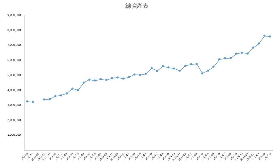 最後放上每個月資產紀錄圖(從2022/8到2026/3,4還沒結束所以還沒結算)
