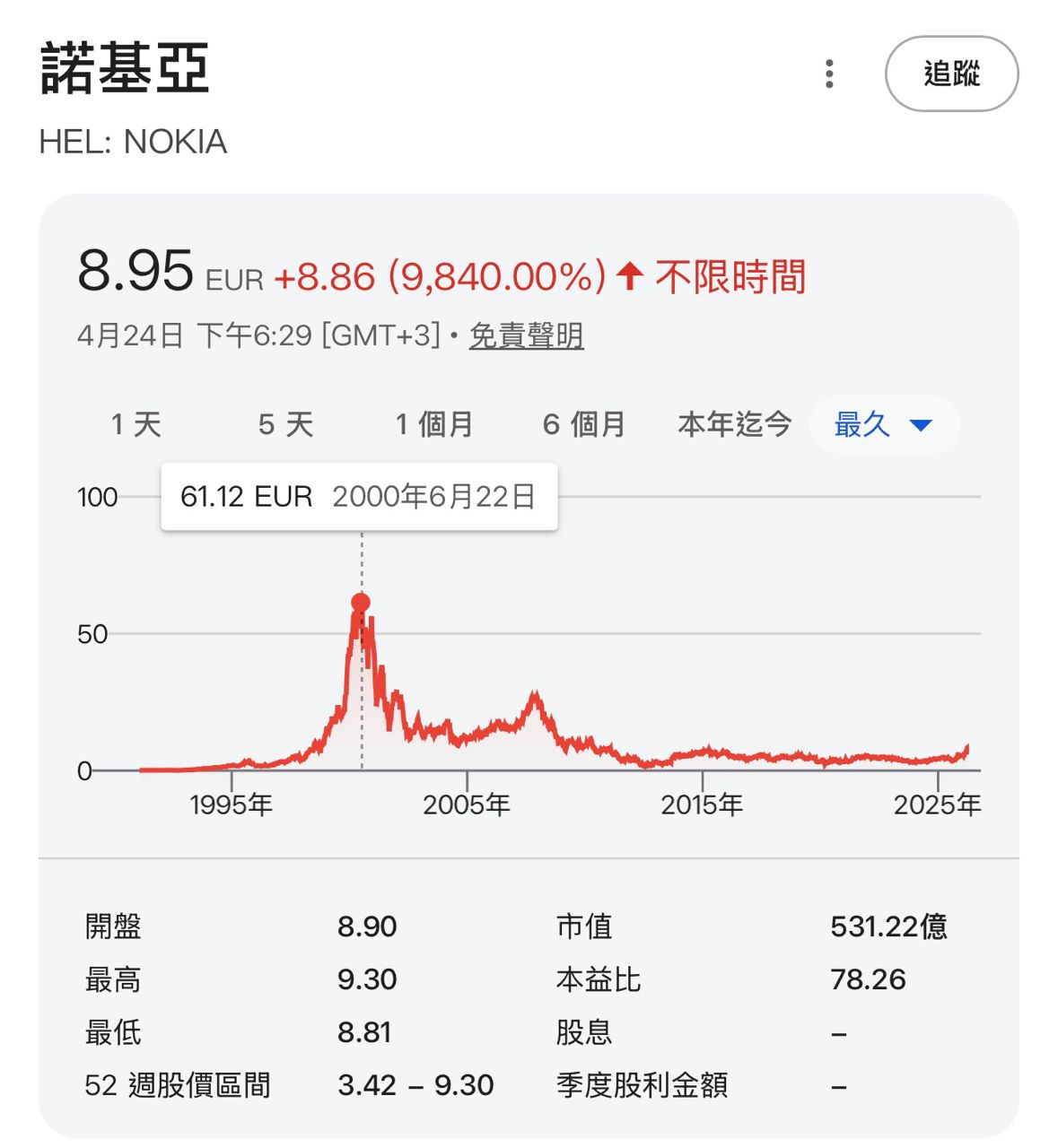 : Nokia 的轉型: 賣掉手機部門後,Nokia 轉向電信設備(5G 網路),雖然市值無