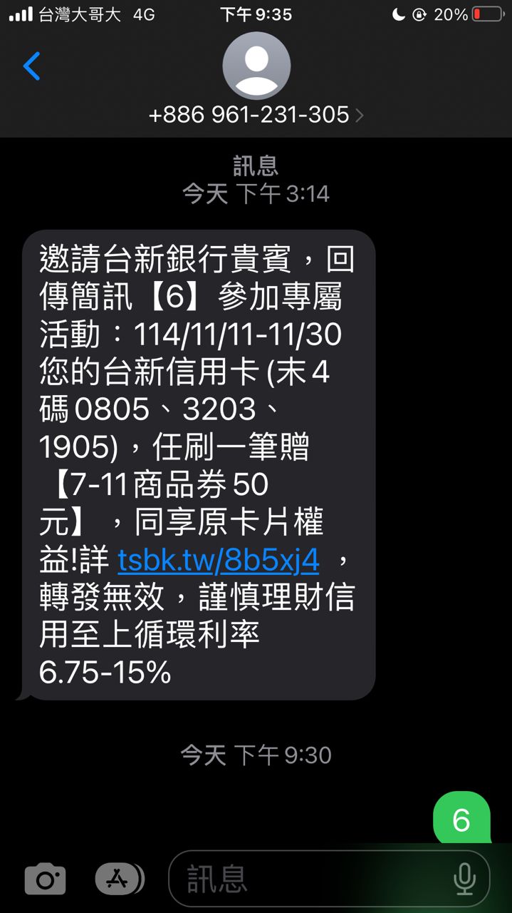 邀請台新銀行貴賓,回傳簡訊【6】參加專屬活動:114/11/11-11/30您的台新信用卡(末4