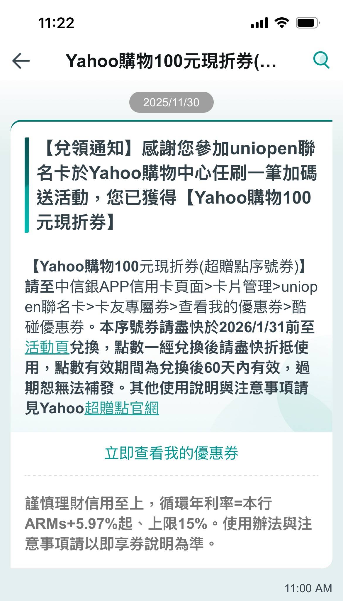 Re: [情報] 中信uniopen卡 Yahoo加碼券已經可領了