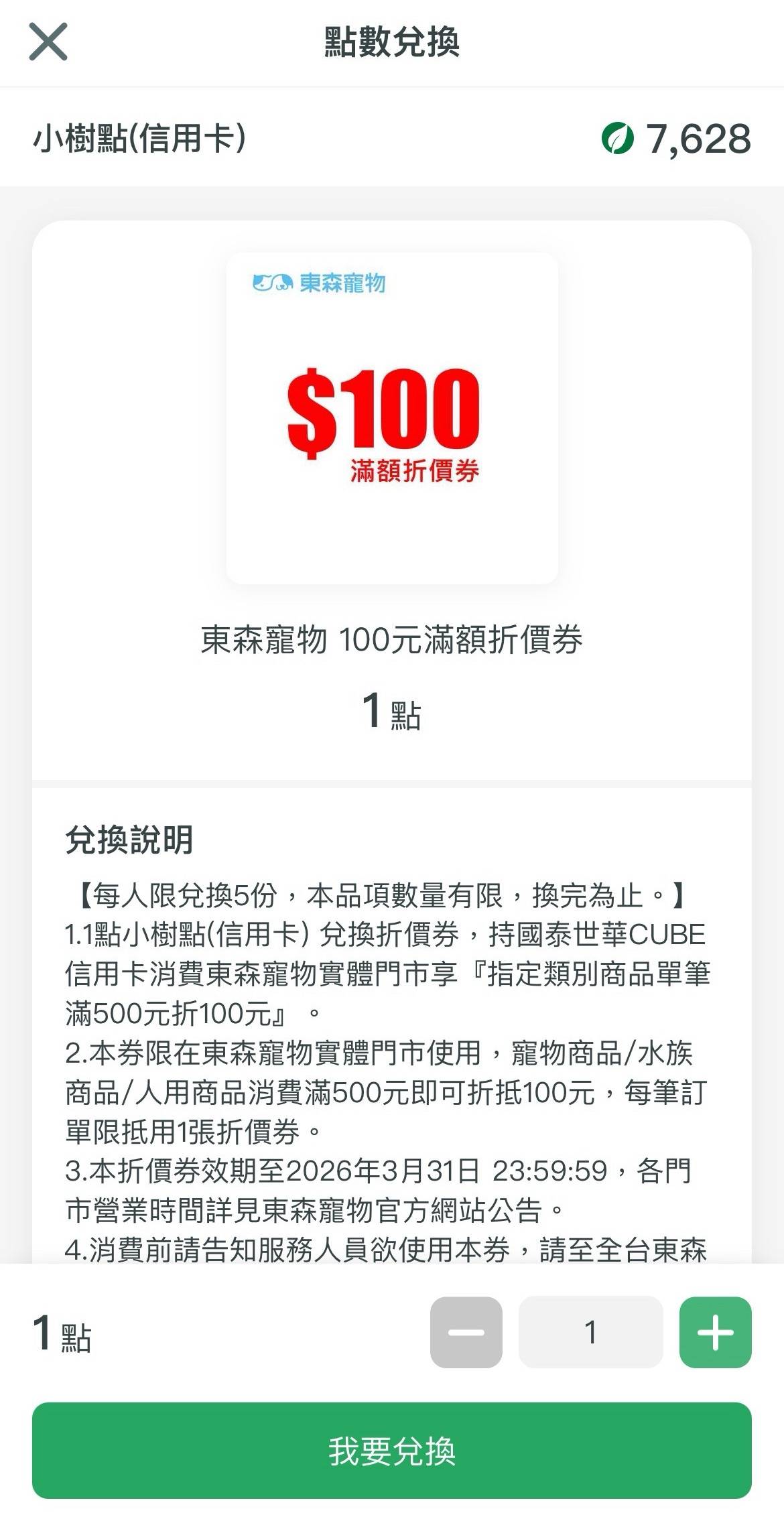 另外 東森寵物有小樹點1點換100元折價券 但要滿500才可使用