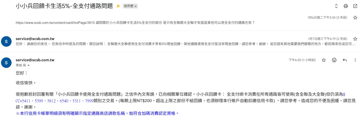 : 回信不意外地確認全支付只有全聯/大全聯才有5%