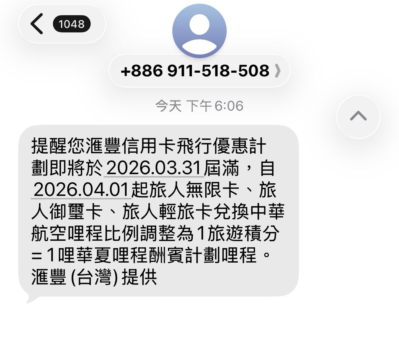 剛剛收到簡訊,滙豐飛行兌換積分兌換中華航空里程突然又調整回來1比1了,不過暫時公