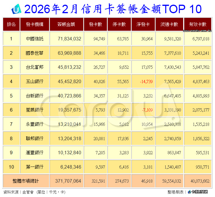 2026年2月簽帳金額3,717億元,較2026年1月下降,但為歷年同期次高