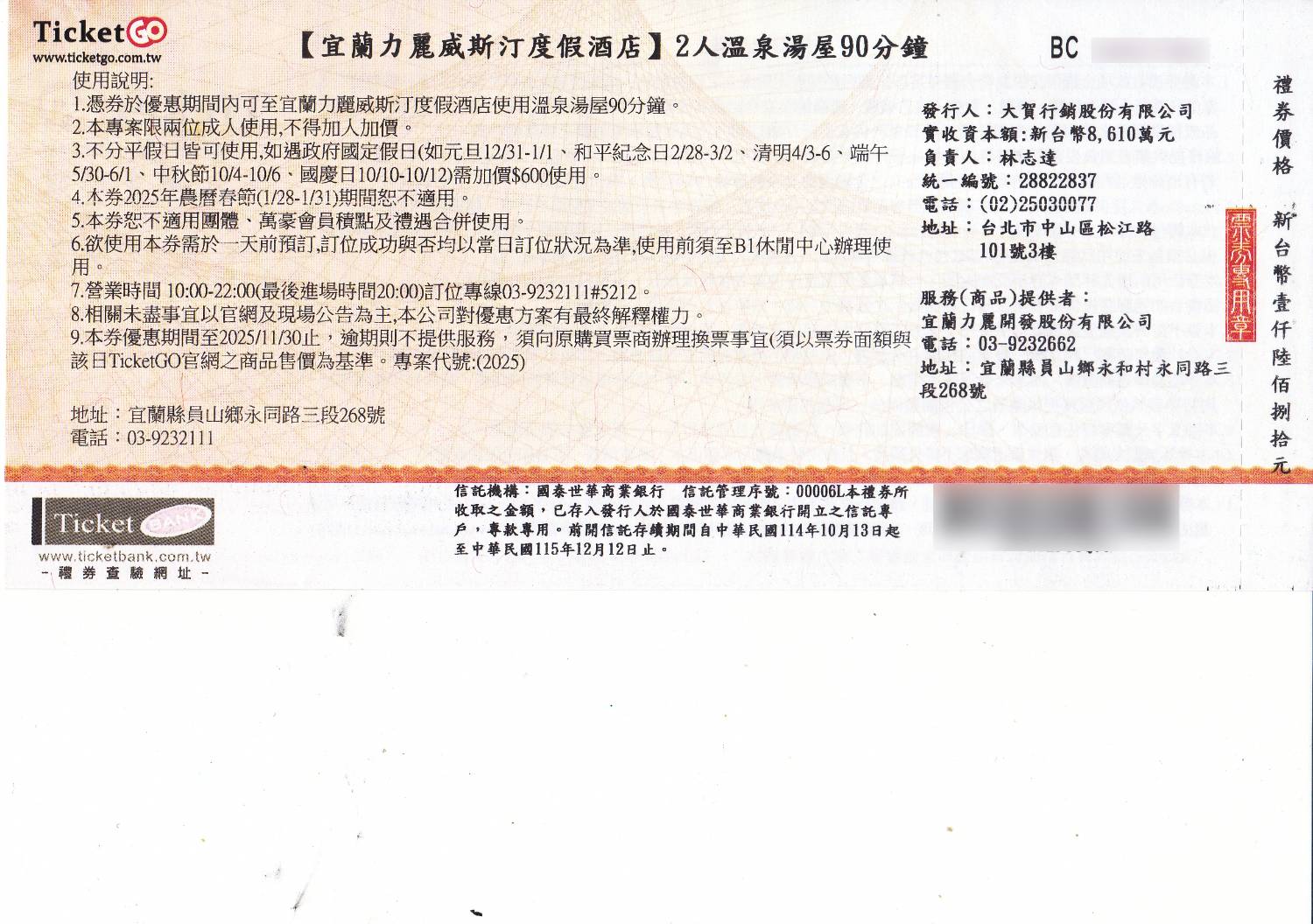 1.憑券優惠期間內可至宜蘭力麗威斯汀度假酒店使用溫泉湯屋90分鐘。