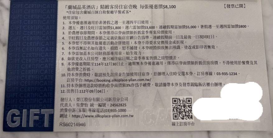 2. 蘭城晶英住宿券四張(來自野蠻王妃團購)