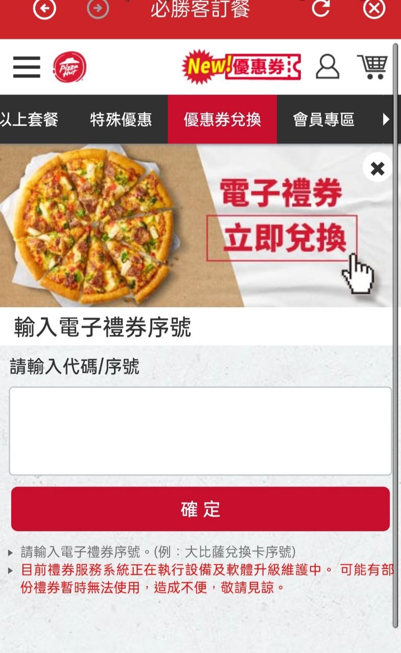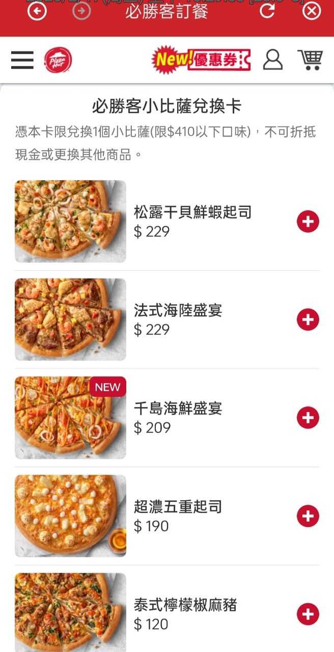 下之比薩口味),不可折抵現金或更換其他商品;若選擇兌換高於NT$410之比薩口味需另外