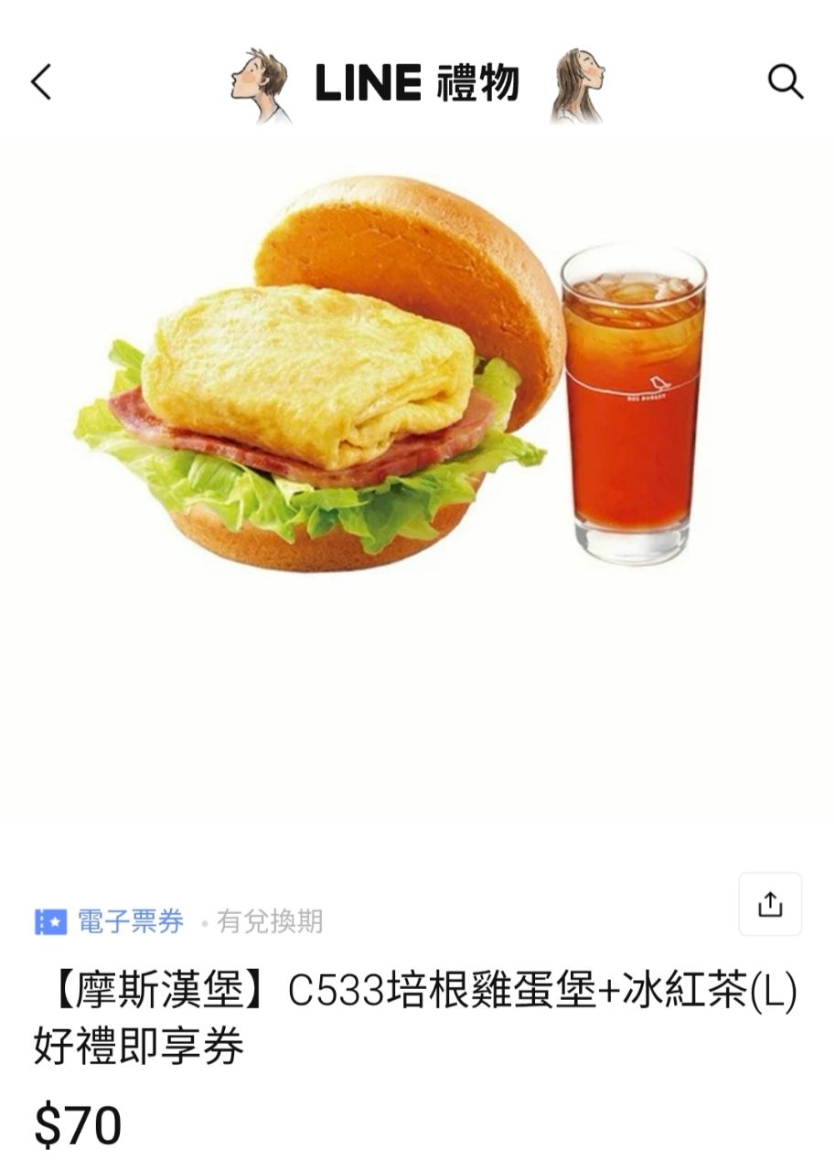 1.【摩斯漢堡】C533培根雞蛋堡+冰紅茶(L),有26張,$55/張;購買5張(含)以上,$53