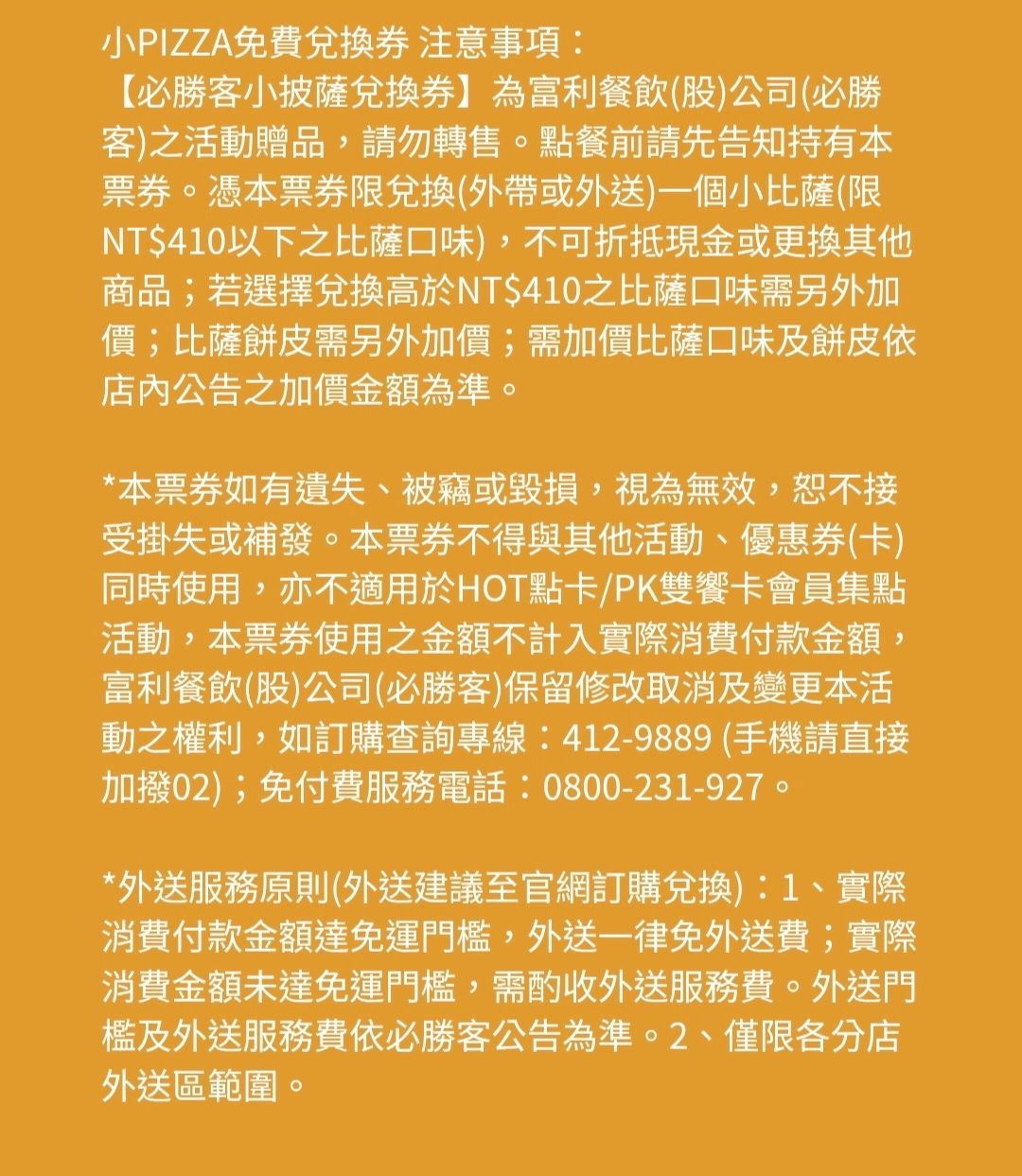 一、點餐前請先告知持有本票券。憑本票券限兌換(外帶或外送)一個小比薩(限 NT$410以