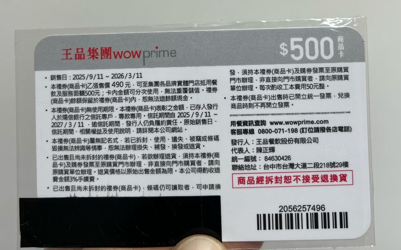 商品名稱:王品集團商品卡 面額500元