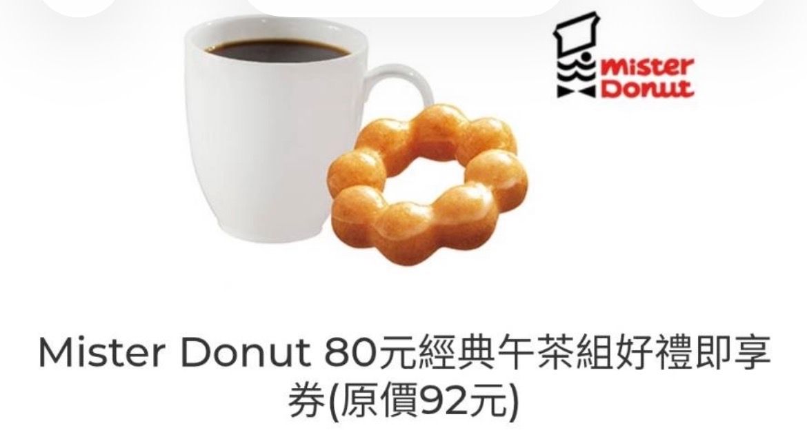 6.Mister Donut 80元經典午茶組好禮即享券(原價92元),數量:1,效期2026/05/23,