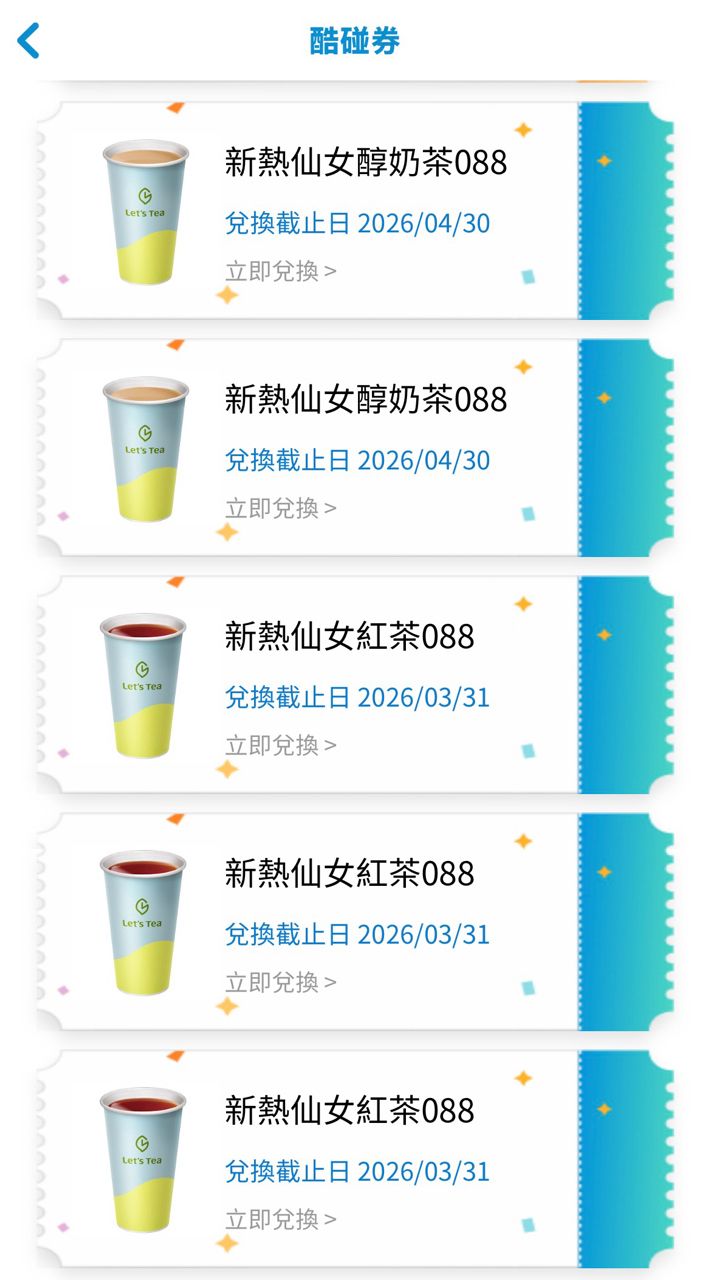 1. 新熱仙女紅茶(酷碰券),效期2026/03/31,數量:3,1杯15 OP