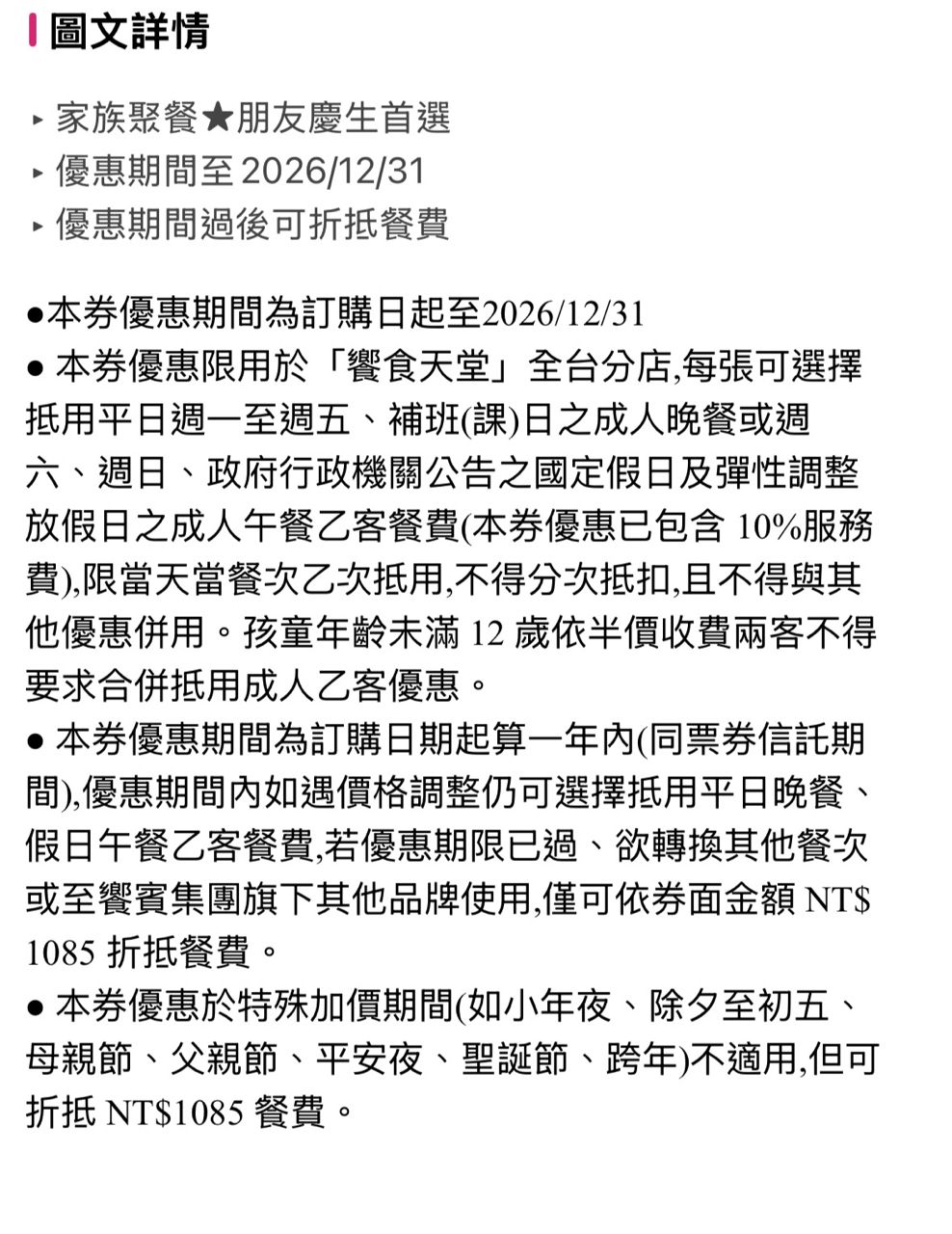 其他说明:2026/12/31,超過折抵餐費1085