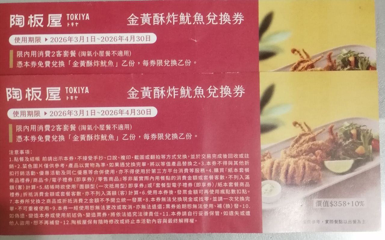 [交易] 陶板屋金黃酥炸魷魚兌換券
