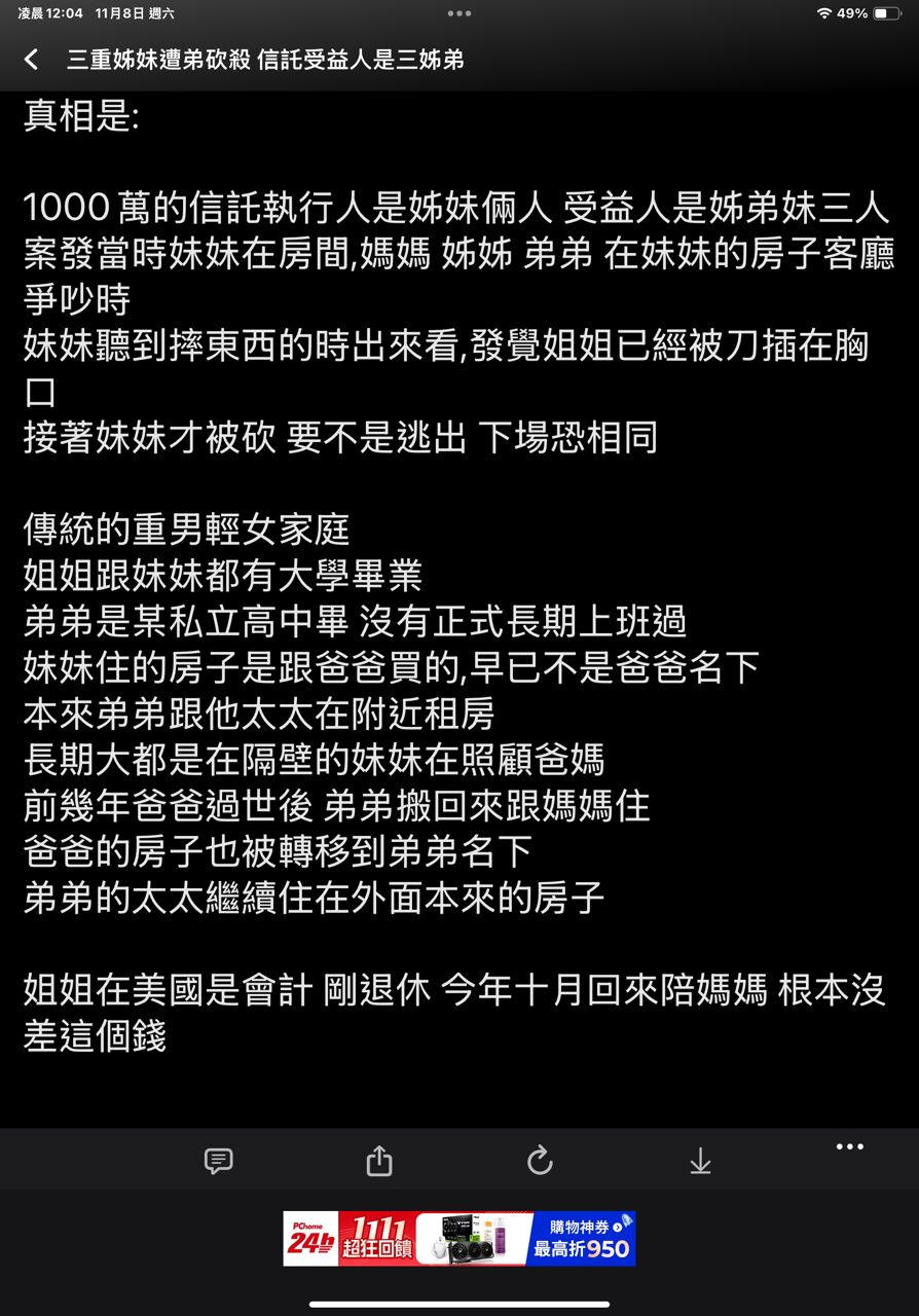問題,引發弟弟持刀揮砍姊、妹,導致姊姊胸口中刀送醫不治,而妹妹則全身多處刀傷,