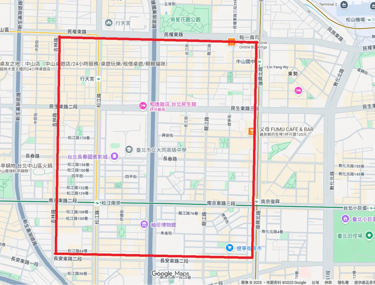 1.地點:復興以西,吉林以東,民權以南,長安以北(如圖)