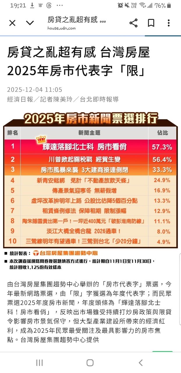 另外,民眾票選2025年度房市新聞,年度頭條為「輝達落腳北士科!房市看俏」,反映出