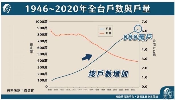 一路從1946年漲到2020年,就是因為家戶數持續上升啊,畢竟房子是一戶一戶賣吧