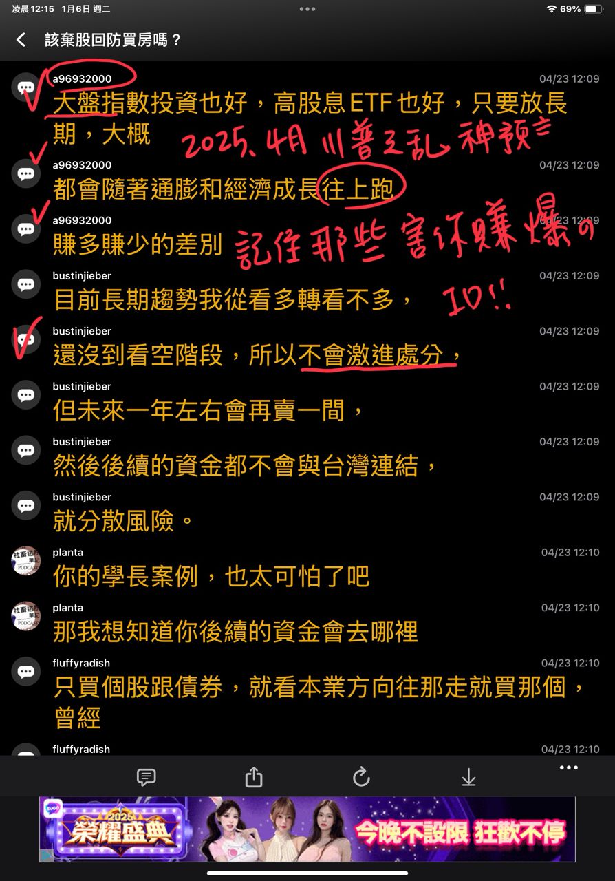 有錢人全部都要啦」,認為將股市獲利轉向房地產才是長久之計。