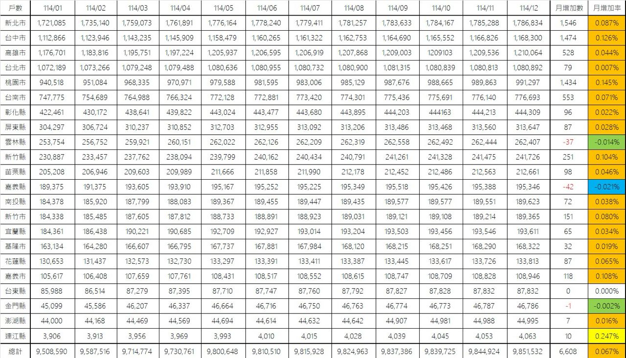 總戶數:9,851,532 (+6,608 / +0.067%)