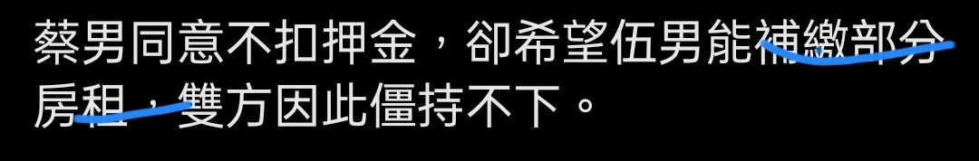 蔡男同意不扣押金,卻希望伍男能補繳部分房租,雙方因此僵持不下。