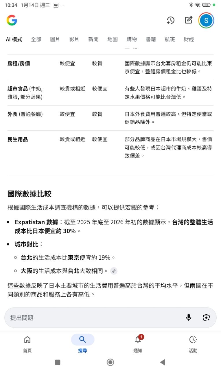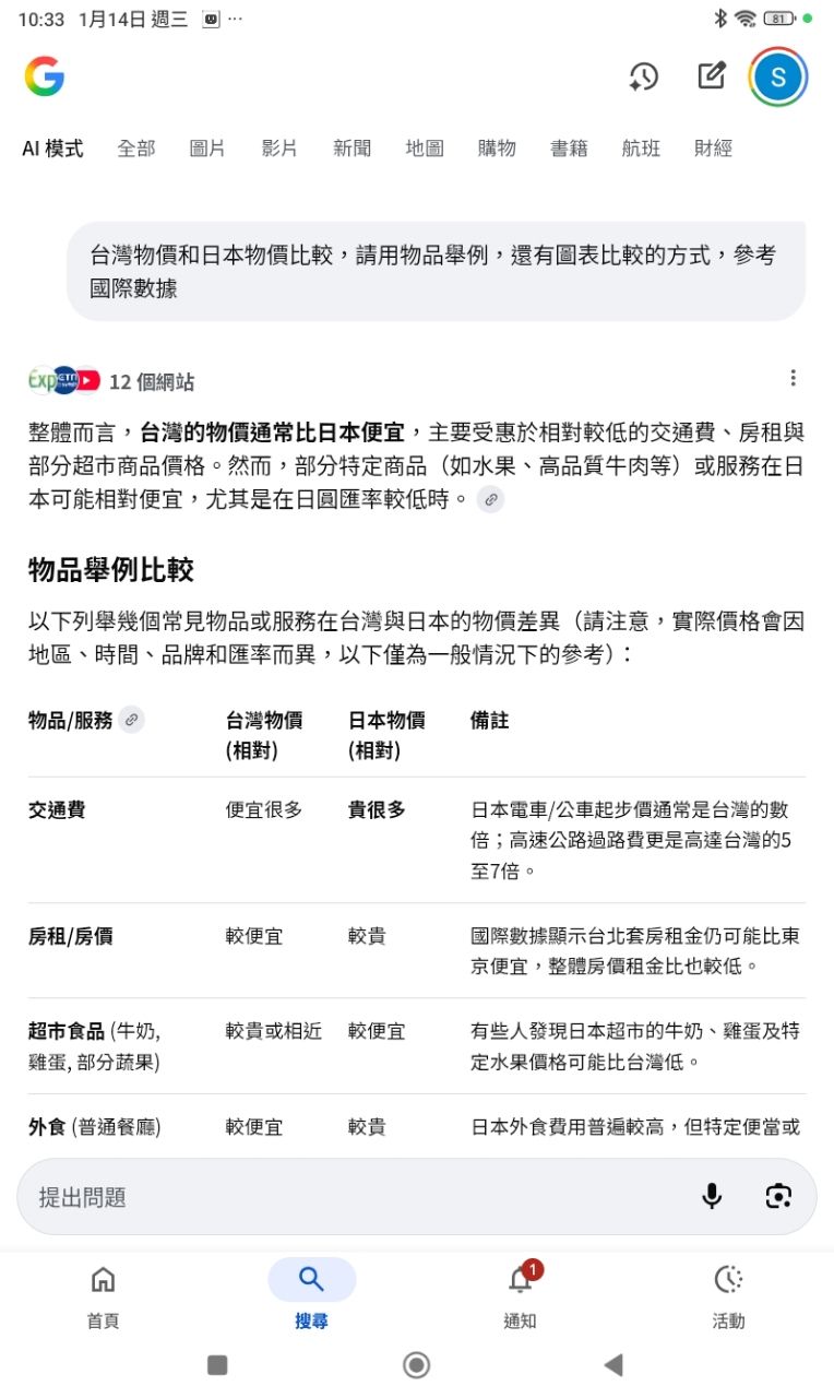 但是還是不敢相信台灣的物價,真的比日本貴嗎?所以就問了一下AI,沒想到AI點出了一