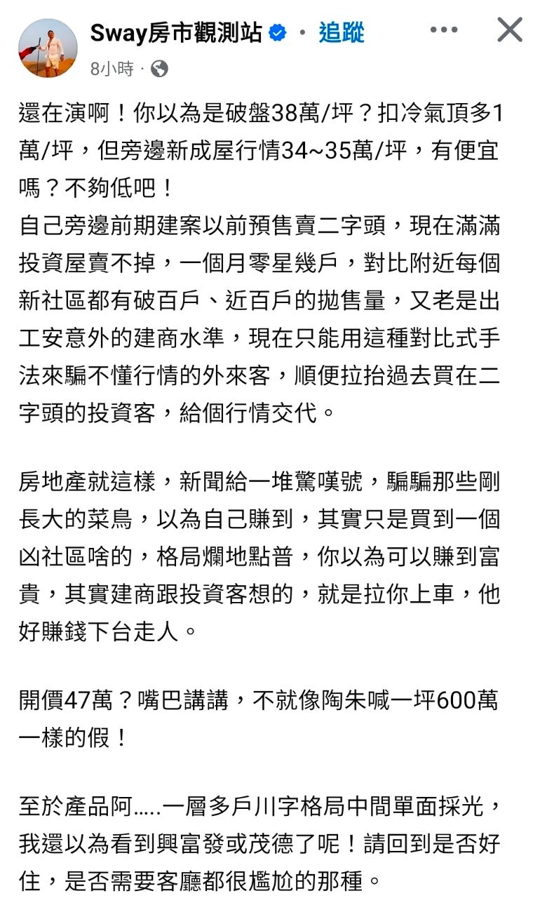 還在演破盤 38 萬一坪,但旁邊新成屋 34、35 就買得到,哪來便宜。
