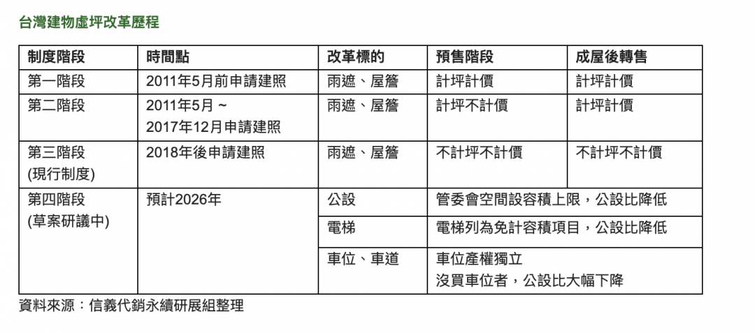 信義代銷指出,回顧台灣推動實坪制的進程,2018年實施雨遮不計坪不計價新制交替期間