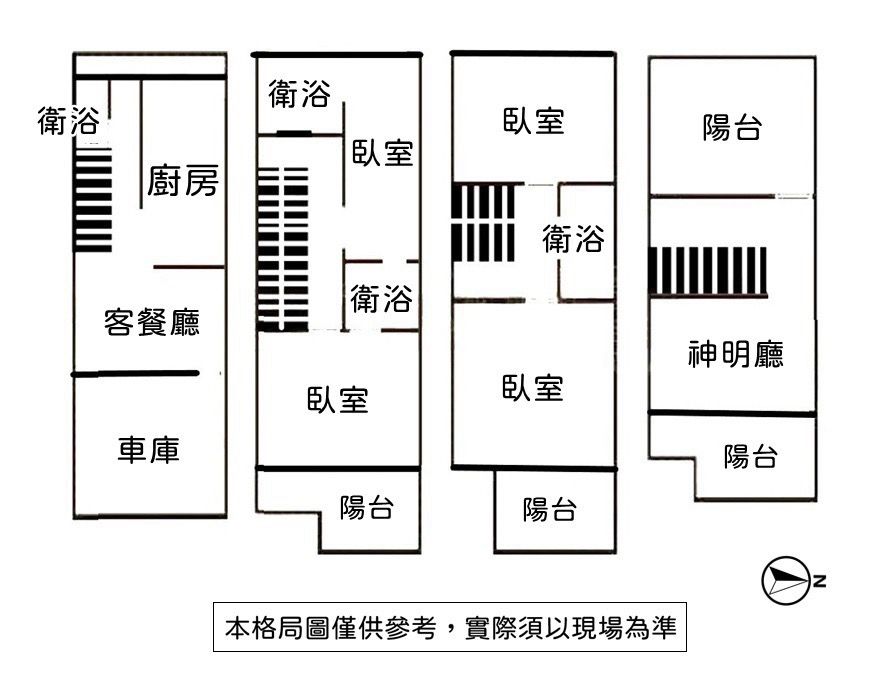 *前院停車,1樓客餐廳,2.3樓共四間臥室,4樓可規劃神明廳
