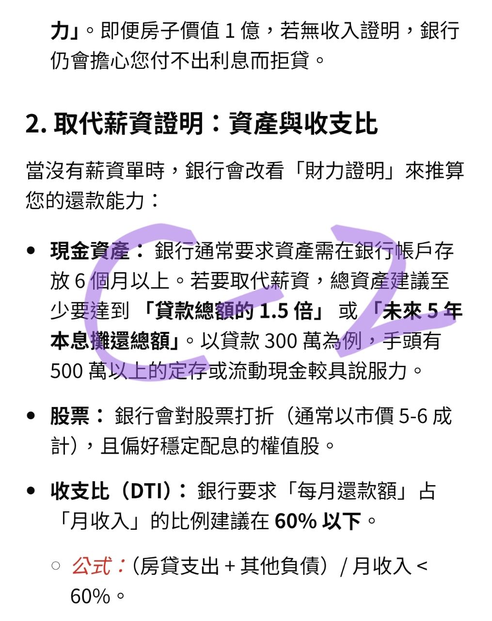 2.手上的現金和股票要多少錢才可以取代薪資所得,收入支出比多少比較容易向銀行貸款?