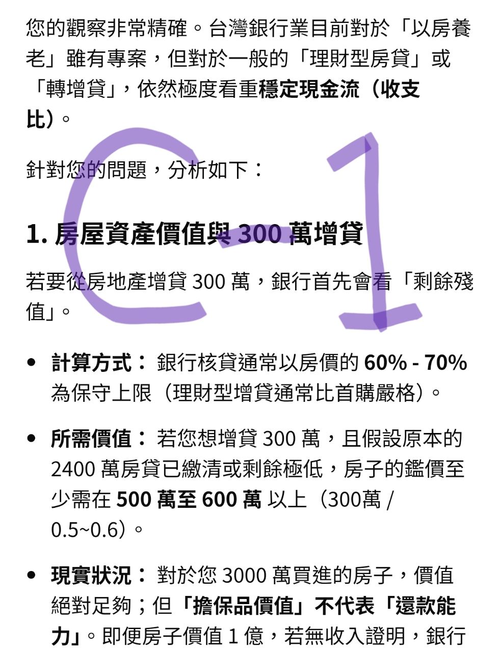 1.沒有薪資現金流,但是如果有股票或現金,假設從房地產抵押增加貸款,貸款出來300萬,