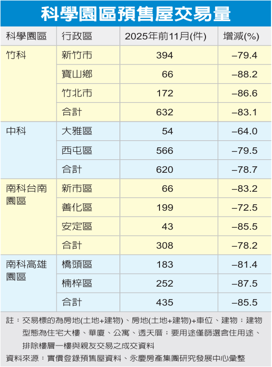 園區預售屋交易量縮年減達八成以上,中科和台南園區也超過七成五,顯示儘管有園區的