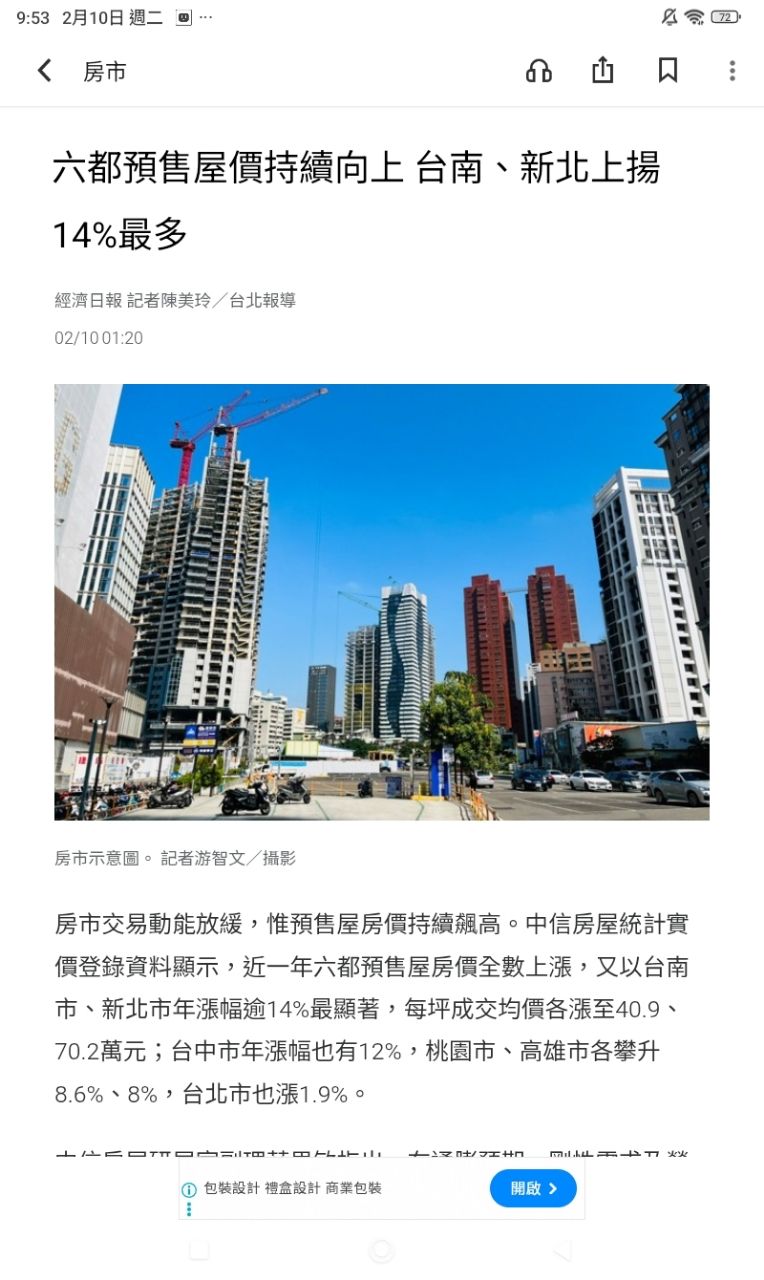 [新聞] 六都預售屋價持續向上 台南、新北上揚14%