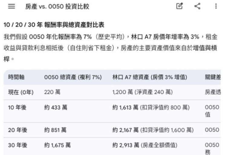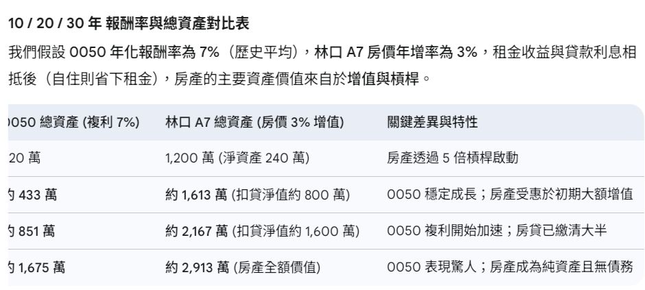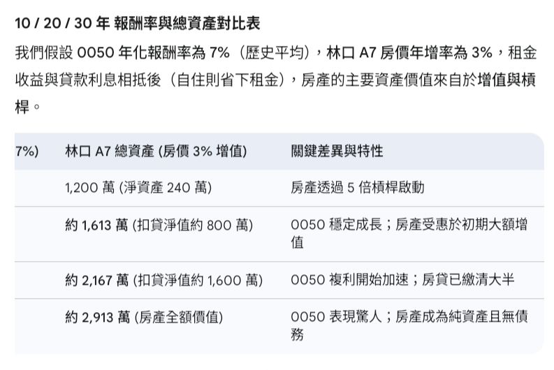 我們假設 0050 年化報酬率為 7%(歷史平均),林口 A7 房價年增率為 3%,租金收益與