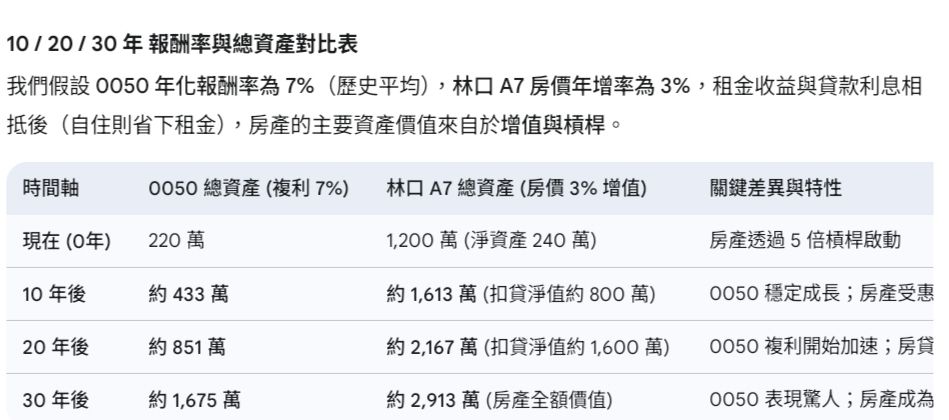 * 如果你是首購: 買房(林口 A7)在 20-30 年後的資產規模通常會大於單純投 0050,