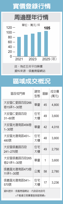 偏大安區,但也頗多信義區門牌,房價不及正大安區的高,相對較易入手,今年1、2月成