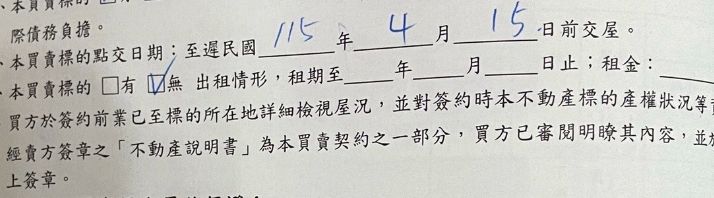 當初買賣簽約上是訂定4/15交屋
