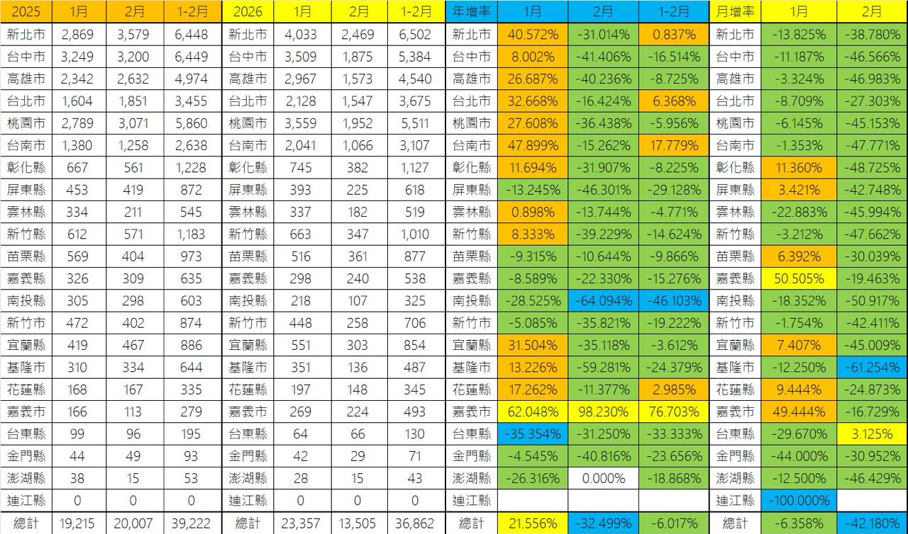 [閒聊] 2026年02月全國買賣移轉棟數