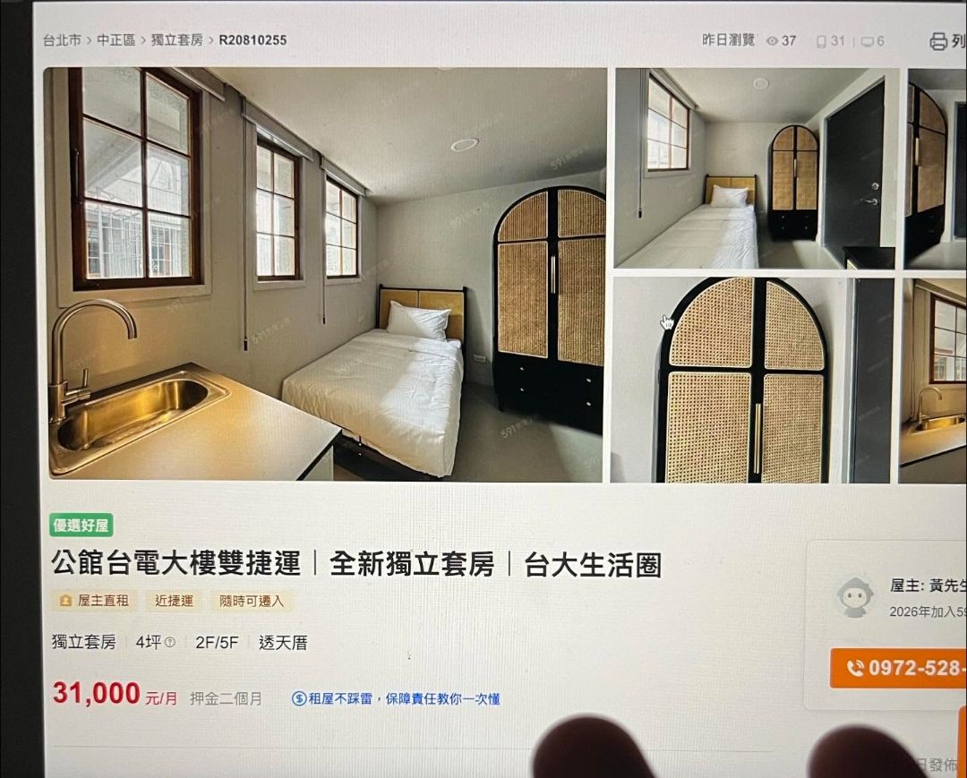 房型,雖然緊鄰捷運公館站與台電大樓站,但僅僅4坪大一個月租金就高達3萬1千元,離
