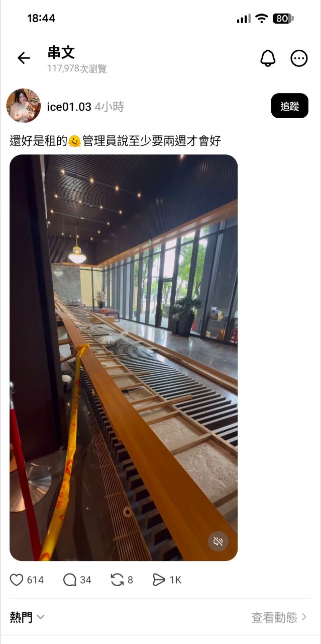大意是一樓大廳的天花板掉下來 保全命大沒事