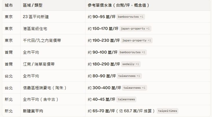 [閒聊] 台灣,南韓,日本首都房價粗估比較