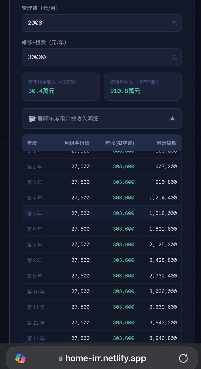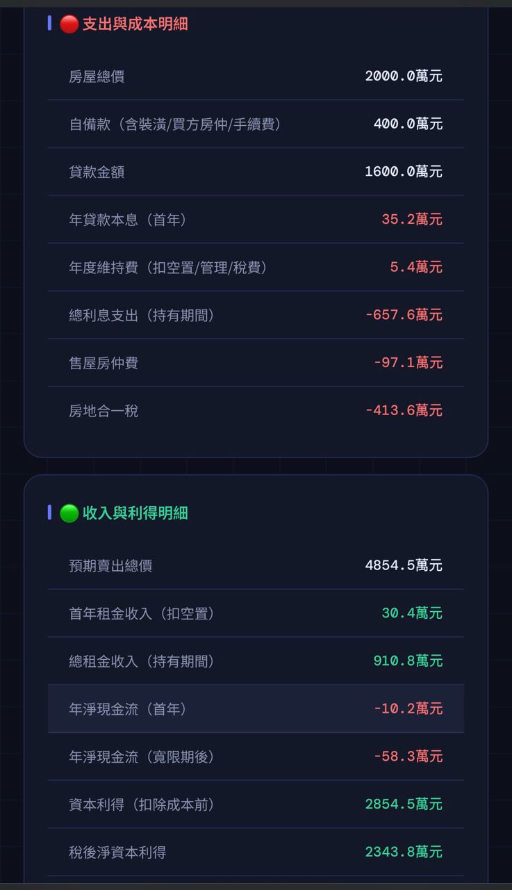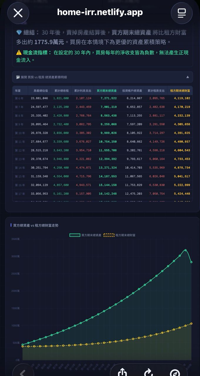 : 供的房貸試算太過陽春,沒辦法算出「真實的投資報酬率(IRR)」。如果自己拉 Exce
